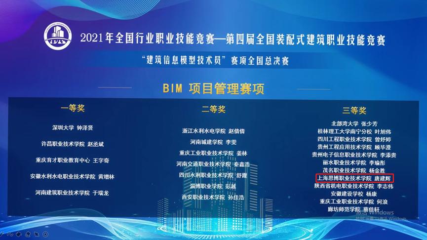 我院学生在2021年全国行业职业技能竞赛——第四届全国装配式建筑职业技能竞赛“建筑信息模型技术员”赛项全国总决赛中取得优异成绩